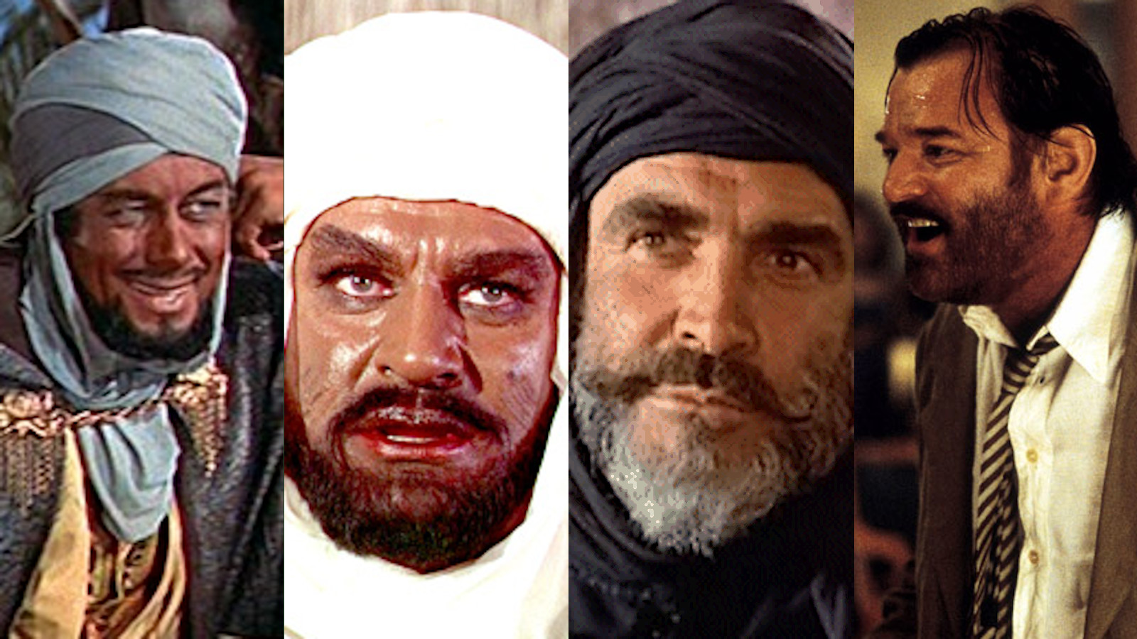 A gallery of white actors in brownface. Left to right: Rex Harrison in King Richard and the Crusaders (1954); Laurence Olivier in Khartoum (1966); Sean Connery in The Wind and the Lion (1975); Brendan Gleeson in The Tailor of Panama (2001).