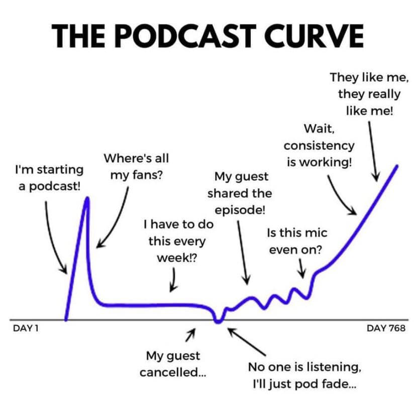 The “podcast life cycle” curve, referenced at the beginning of the episode. Found on a Facebook group, November 2020.